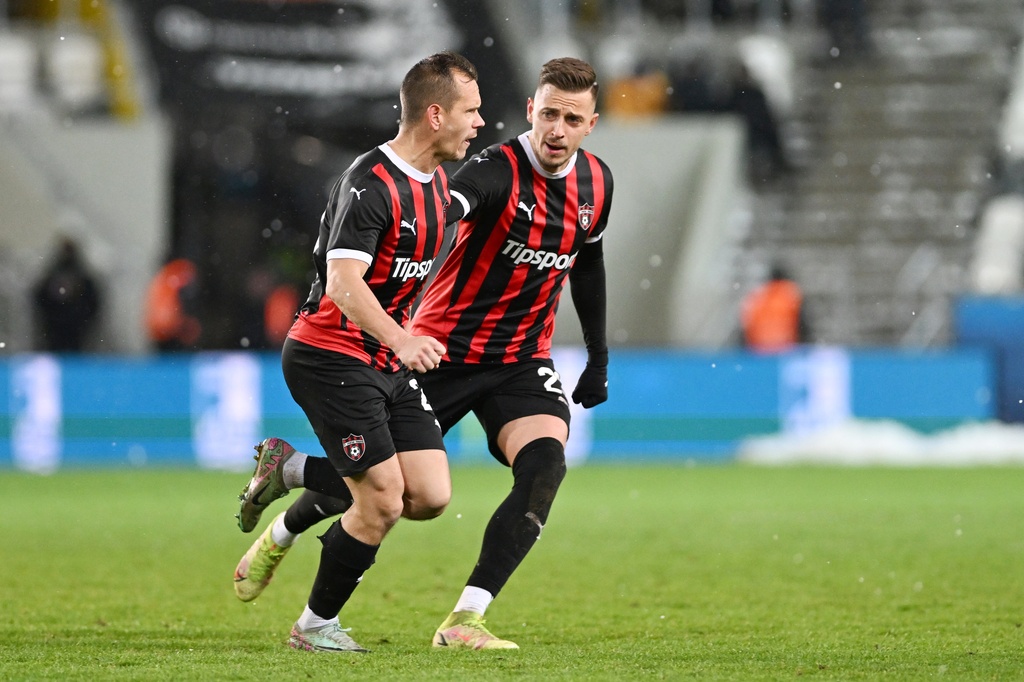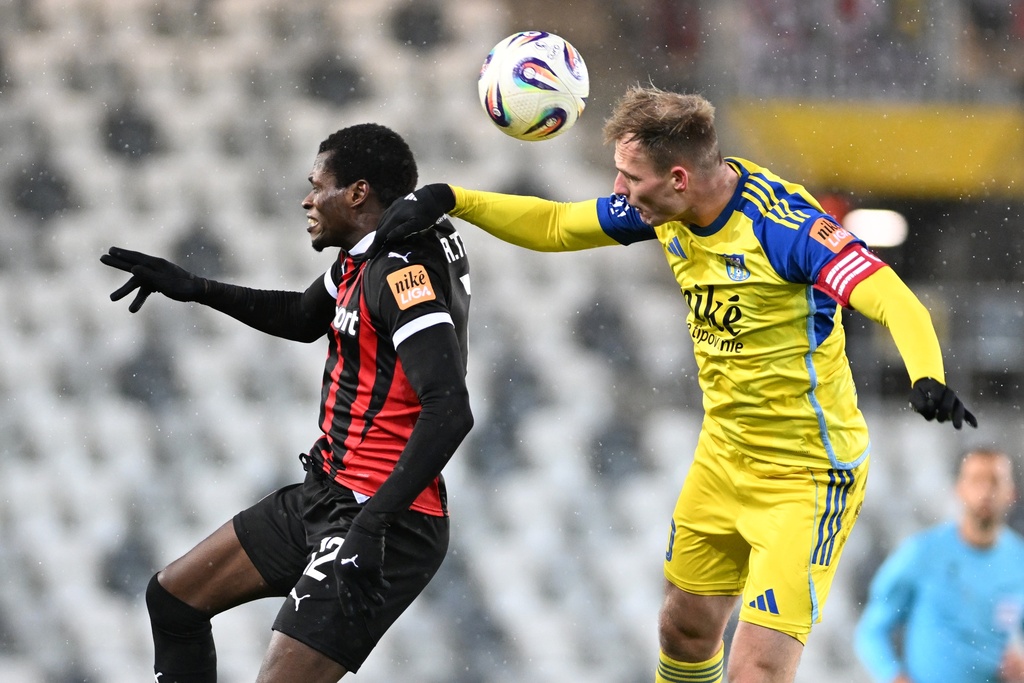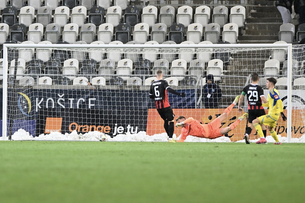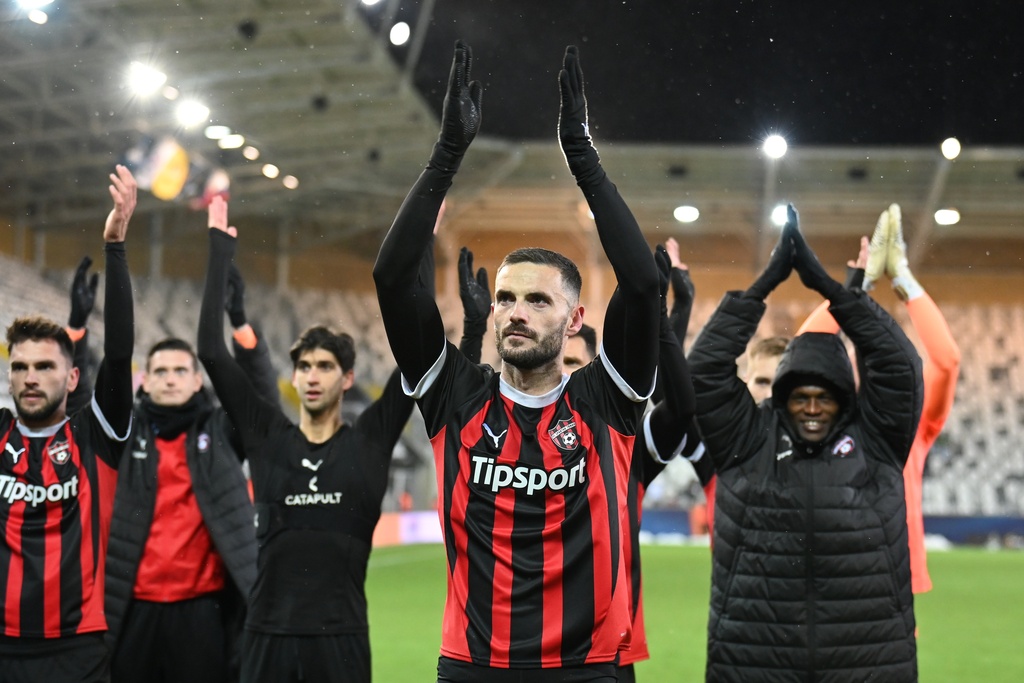 Na snímke radosť hráčov Trnavy po góle, vľavo kapitán Martin Mikovič a Filip Twardzik počas zápasu Niké ligy medzi FC Košice a FC Spartak Trnava v Košiciach v sobotu 22. novembra 2025.