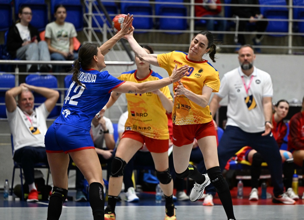 Na snímke s loptou Alicia Maria Gogirla ( Rumunsko) a dole Karin Bujnochová (Slovensko) v zápase 1. skupiny Euro Cup: SLOVENSKO - Rumunsko v hádzanej žien 5. marca 2026 v Michalovciach.