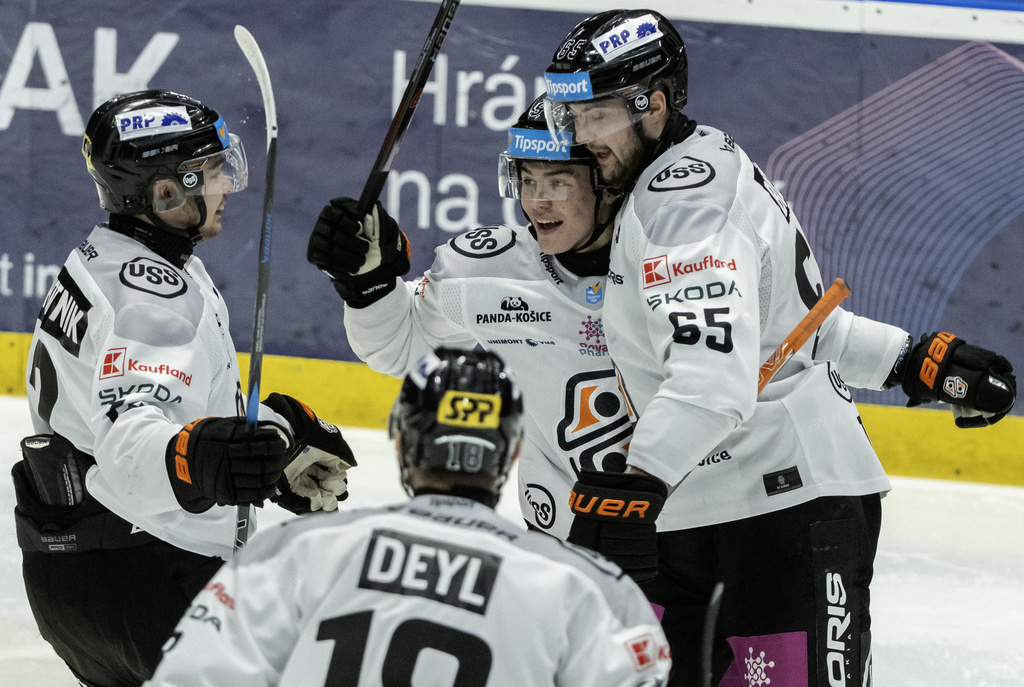 Na snímke hráči Košíc sa tešia z výhry po prvom zápase semifinále hokejovej Tipsport ligy HC Slovan Bratislava - HC Košice v Bratislave v nedeľu 5. apríla 2026. Košičania zvíťazili na ľade Slovana 3:2 po predĺžení.