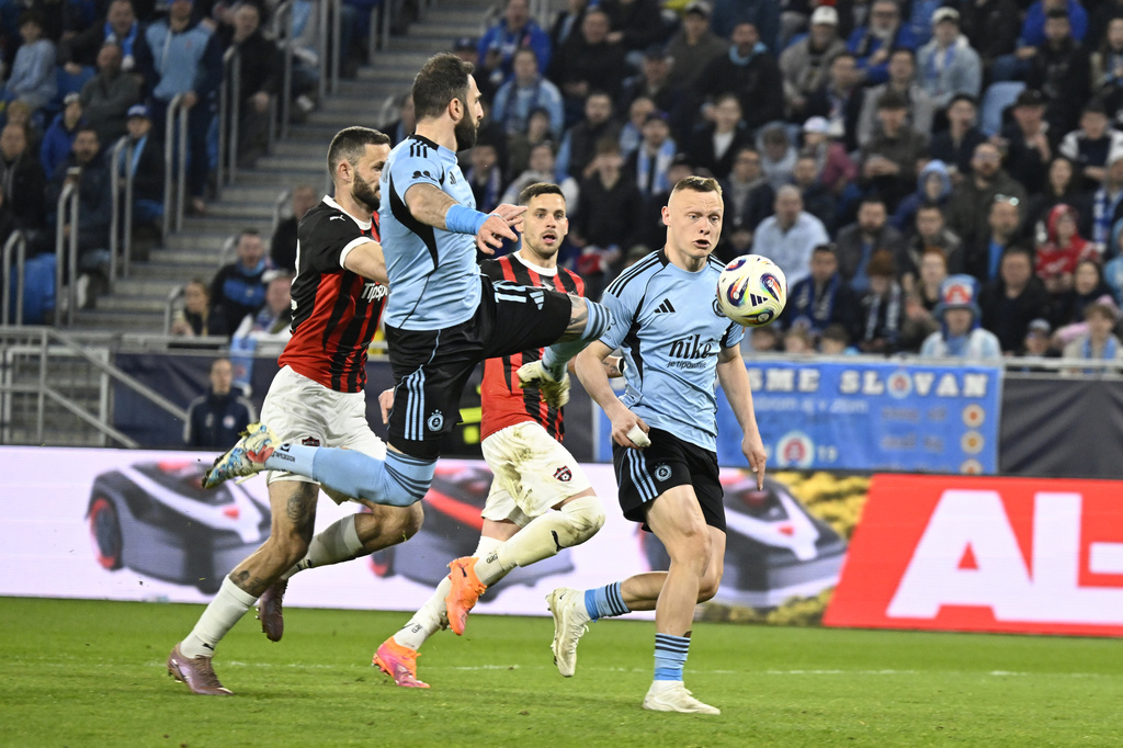 Na snímke vľavo Rahim Ibrahim (Slovan) strieľa druhý gól v 5. kole nadstavbovej časti Niké ligy skupiny o titul ŠK Slovan Bratislava - FC Spartak Trnava 11. marca 2026 v Bratislave.