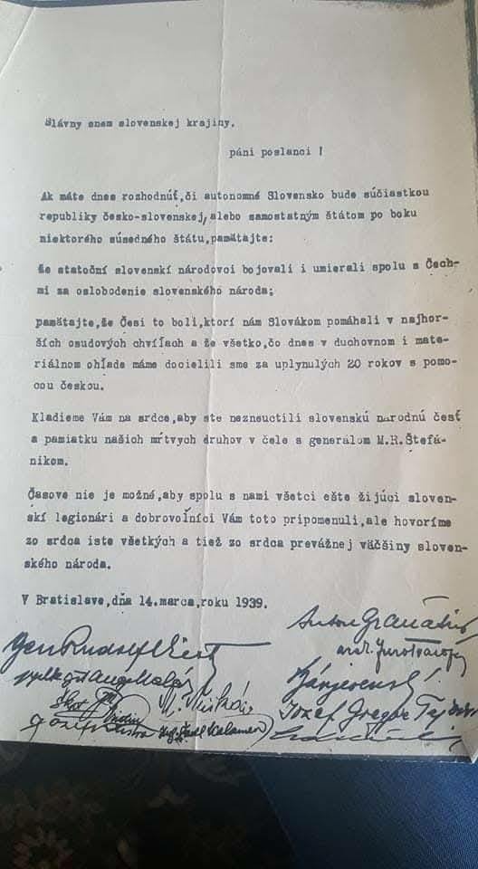 Dodnes má odložený list, ktorý 14. marca 1939 posielali narýchlo československí legionári Slovenskému snemu ešte pred ich rozhodnutím na protest proti rozbitiu Československa – považovali za amorálne opustiť Česko, nášho priateľa v tých najhorších osudových chvíľach, a v hitlerovskej politike už vtedy videli hrozbu, s ktorou nemožno spolupracovať. Podpísali ho generál Viest, spisovatelia Janko Jesenský či Jozef Gregor Tajovský, ale aj Branislavov strýko, známy architekt Juraj Tvarožek.