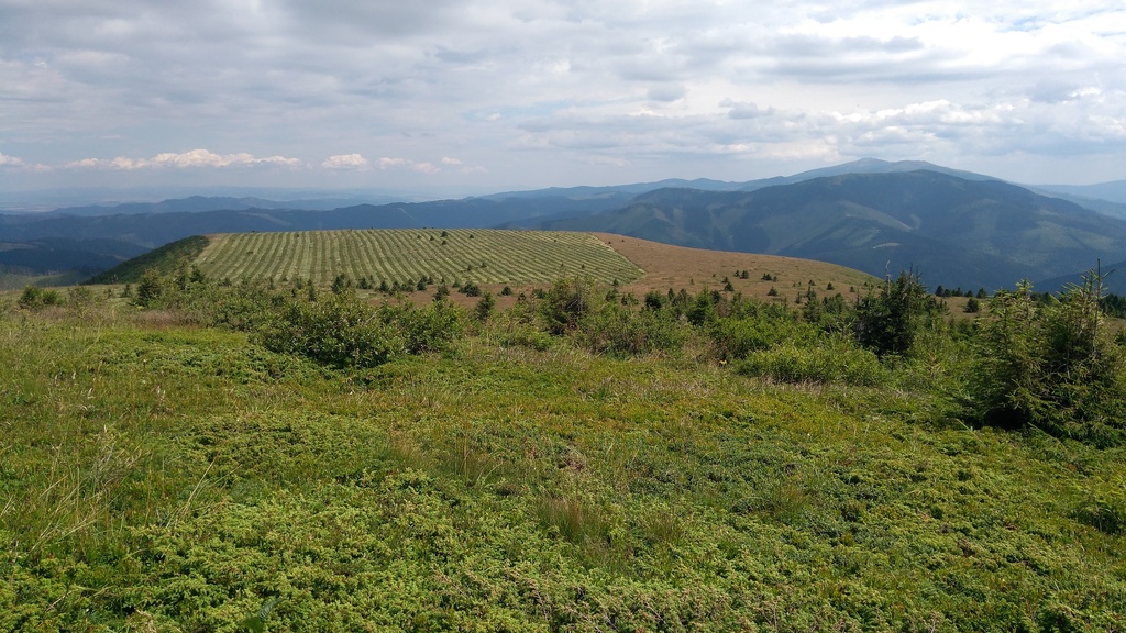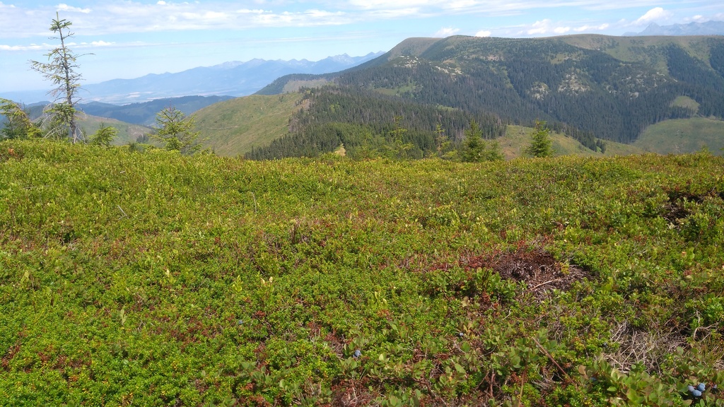 Snímka 11 - Pohľad zo Zadnej hole na Veľký bok (plochý odlesnený kopec v popredí vľavo). Za nim vpravo v pozadí Vysoké Tatry.