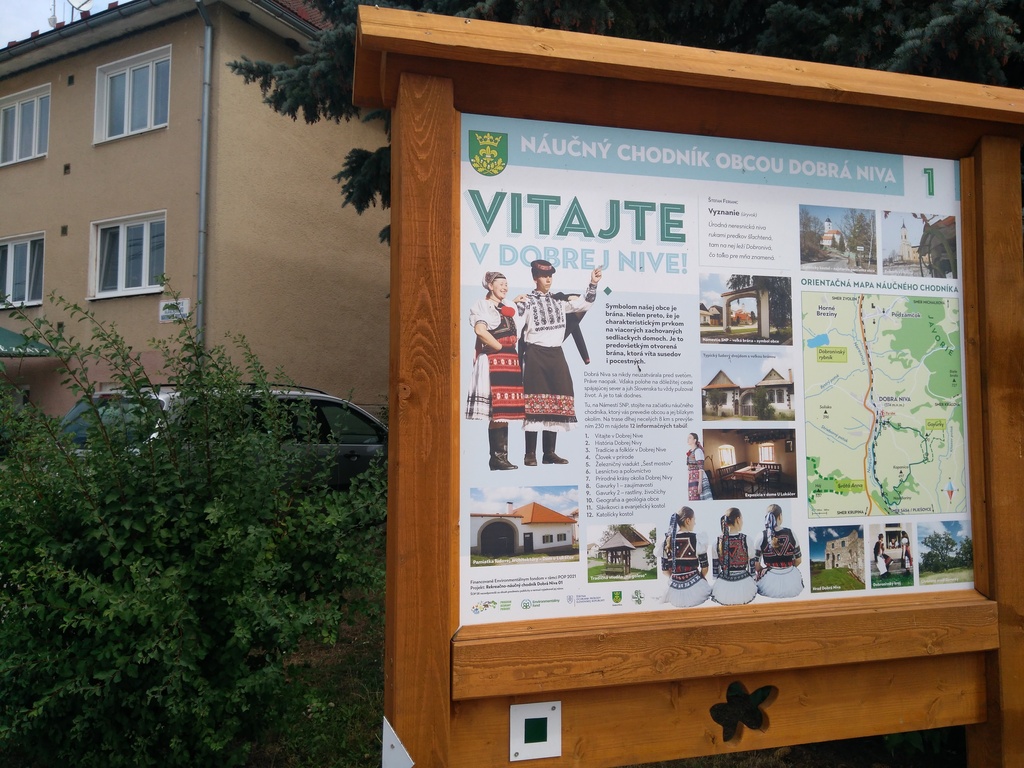 Náučný chodník v okolí kedysi kráľovského mestečka Dobrá Niva neďaleko Zvolena má 8 km. Nájdeme na ňom 12 informačných tabúľ a veľa zaujímavostí: na svoje si prídu milovníci železníc, stromov aj výhľadov. S domácim turistom Jánom Slosiarikom a starostom Milanom Jakubíkom začíname pri prvej tabuli v centre obce. Vzápätí prechádzame cez bránu, ktorá je súčasťou parčíka: