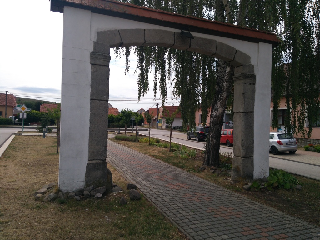 Snímka 2 – Druhá tabuľa náučného chodníka je pri Obecnom úrade (budova za autami), môžete k nej prejsť popod bránu, ktorá pripomína tradičnú architektúru v obci.