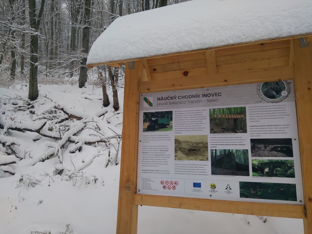 V najbližších minútach sa budeme pohybovať pod Inovcom, teda v pohorí Považský Inovec. Nájdete tam náučný chodník, ktorý ešte dýcha novotou, keďže ho robili na jar tohto roku: tabule sú ako vyumývané, drevo ešte svetlé. Poďme sa tam prejsť spolu s Jaroslavou Vanyovou z Lesného hospodárstva Inovec. Prvá tabuľa stojí za horárňou, ku ktorej vedie z konca obce Selec cesta a zároveň cyklotrasa. Na paneli si čítame informácie o lesnej železnici, ktorá už dávno neexistuje.