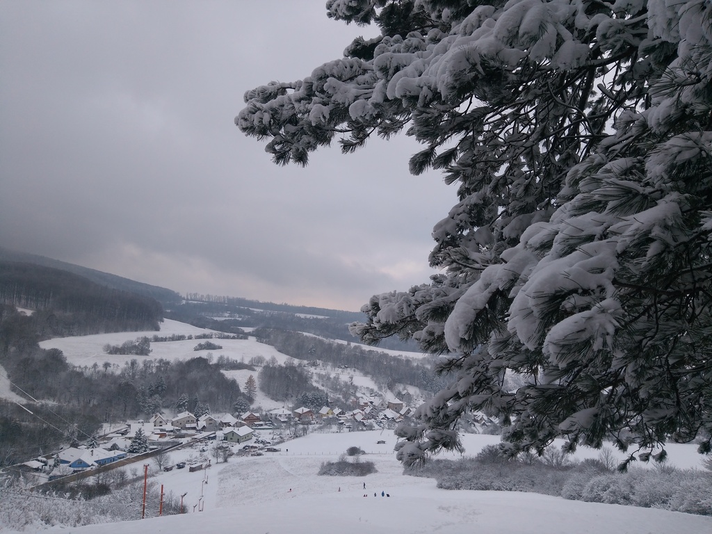 Snímka 5 – Výhľad od prístrešku Pod borovicou. Vidno Selec a na úpätí svahu sánkujúce sa deti.