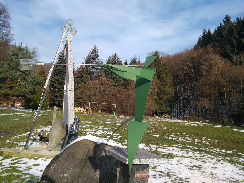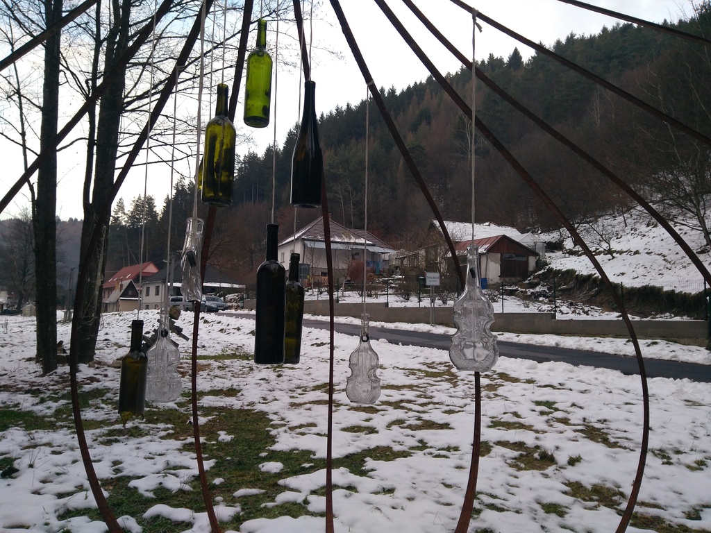 Snímka 15 – Jeden z objektov Jána Samaša pri vstupe do Dolnej Bzovej. Sklo vo vetre cinká; keď sa fľaša rozbije, autor ju nahradí ďalšou.