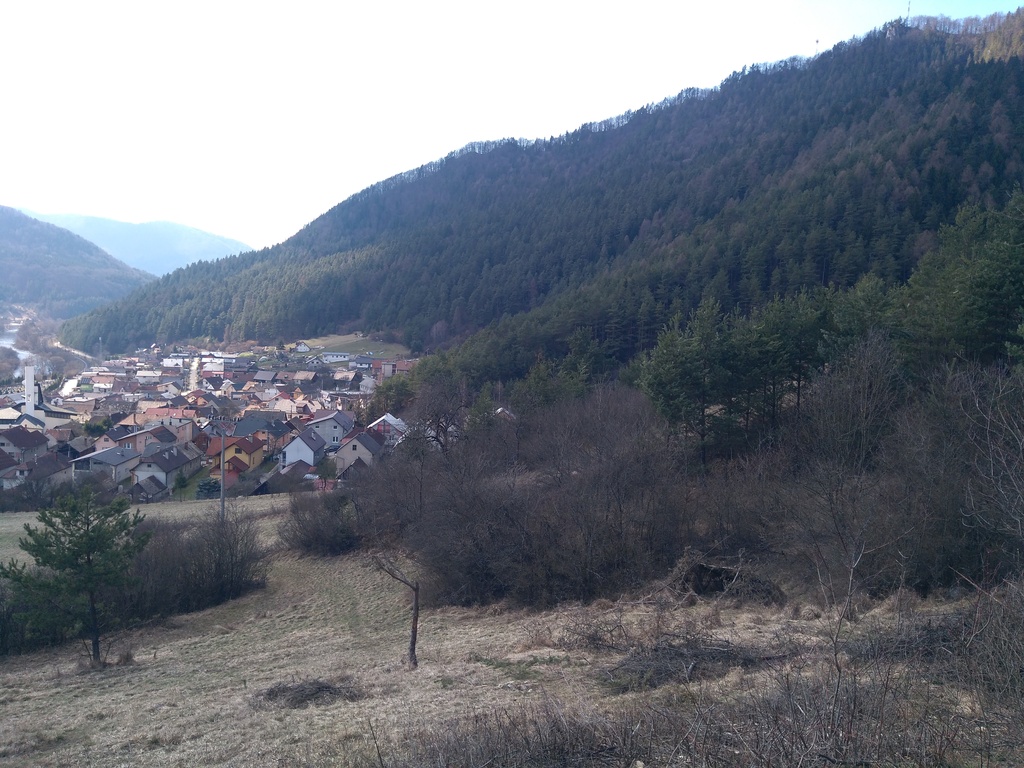 Snímka 12 – Pohľad z krížovej cesty na Švošov. Náučný chodník vedie lesom nad dedinou, teda v úbočí, ktoré je na fotografii.