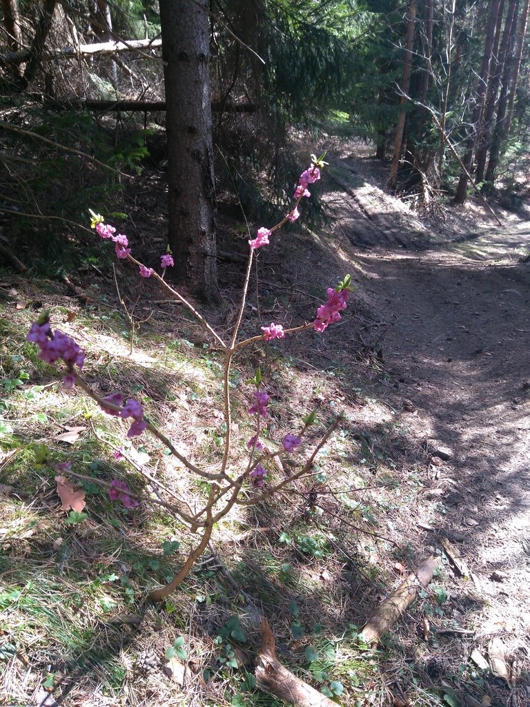 Snímka 5 – Viackrát sme pri chodníku zbadali krásny jarný kvet Lykovec jedovatý. Tu má už rozmery kríčka.