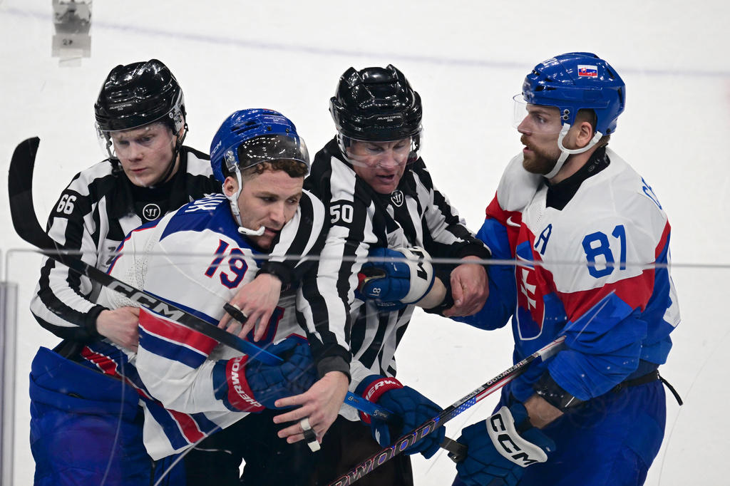 Na snímke slovenský hokejista Erik Černák (81) a hráč USA Matthew Tkachuk počas šarvátky v semifinálovom zápase USA - Slovensko na zimných olympijských hrách 2026 v Miláne v piatok 20. februára 2026.